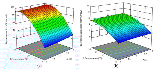 Figure 10. Interactive effects between temperature and pH on (a) sulphate reduction efficiency and (b) sulphate reduction rate.