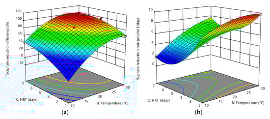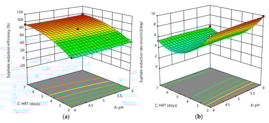 Figure 11a,b shows the interactive effects between HRT and pH on sulphate reduction efficiency and sulphate reduction rate. From the graphs, both responses are not impacted by pH at all HRTs. However, HRT is shown to have different effects on the responses. The sulphate reduction efficiency increases with an increase in HRT, whereas the overall trend for the sulphate reduction rate is that it increases with decreasing HRT. The graphs in Figure 10a,b and Figure 11a,b show that the interactions between pH and temperature (AB) and between pH and HRT (AC) were not strong, which is proven by ANOVA analysis in Table 3.