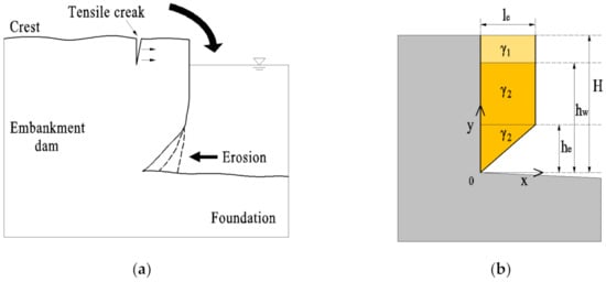 A 2D sketch of a simplified headcut cross-section is shown in Figure 1b. is the embankment height, is the water head in breach, is the erosion height, and is the erosion length (equal to the length of the headcut). The soil mass of the headcut is divided into three different zones according to its specific weight (influenced by water conditions) and shapes. The first zone is rectangular, above the water surface, and has a specific weight of . The second zone is the rectangular part of the headcut under the water surface with a specific weight of . The third zone is the triangular portion of the headcut under the water surface with a specific weight of . When simplifying the headcut geometry and dividing the soil zones, the following assumptions have been made: