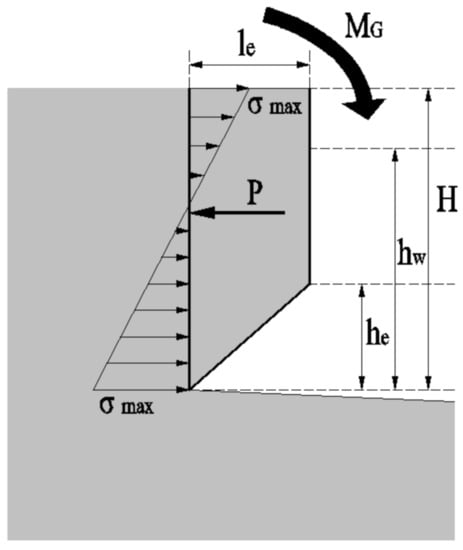As shown in Figure 3, the normal stress on the fixed end section of the headcut consists of two portions: (1) the normal stress resulted from the bending moments, and (2) the normal stress resulted from the normal forces on the section. If distributions of the normal stress due to bending moments are assumed as linear, the distributions of the normal stress can be illustrated as shown in Figure 3. The top part of the headcut is under tension and the lower part is under compression. The maximum tensile stress potentially occurs on the top of the headcut when assuming a linear stress distribution. This relationship can be written as Equation (4).