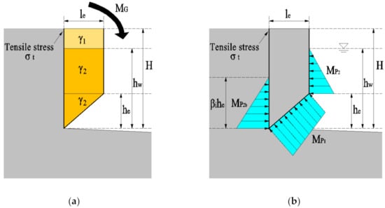Pore pressure is present in the soil and should be considered as a contribution to the moment of forces on the fixed end of the headcut (see Figure 4b). Thus, the moment of the left side water pressure force per unit width () may be expressed as follows: