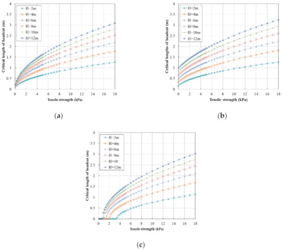 The critical lengths of the headcuts under different soil tensile strengths for a range of embankment heights () from 2 to 12 m. (a) ; (b) ; (c) .