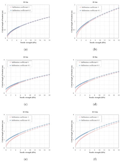 By applying the above parameters into the analytical Equation (33), interesting results were obtained. Three extreme situations were calculated: (1) , soil of the embankment body with high permeability; (2) , soil of the embankment body with moderate permeability; and (3) , soil of the embankment body with no permeability. For each situation, the critical lengths of the headcut under different soil tensile strengths and for a range of embankment heights were obtained, as shown in Figure 5a–c, respectively. In Figure 5a, the critical lengths of the headcut are between 0.1 and 3.1 m. The maximum critical lengths of erosion were observed when the tensile strength of the soil reached the maximum value of 18 kPa. For all embankments of different heights, the critical lengths of the headcut increased as the soil tensile strength increased. In Figure 5b, the critical lengths of the headcut are between 0 and 3.0 m. In Figure 5c, the critical lengths of the headcut are between 0 and 3.0 m.