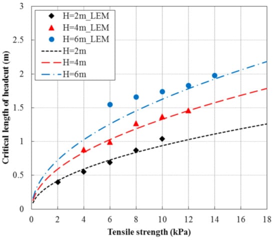 Comparisons of the critical headcut lengths using the soil tensile strength based mathematical model and the simulated results obtained by the LEM are shown in Figure 8. For a 2 m high embankment, simulated calculations were concentrated over a range of soil tensile strengths of 2 to 10 kPa. For the 4 and 6 m tall embankments, the simulated calculations were concentrated over a soil tensile strength range of 4 to 12 and 6 to 14 kPa, respectively. As shown in Figure 8, the critical headcut lengths simulated by the LEM increased as the soil tensile strengths increased. The critical headcut lengths under different soil tensile strengths obtained by the LEM fit the present model well. The simulated results obtained by the LEM agreed reasonably well with the present model.