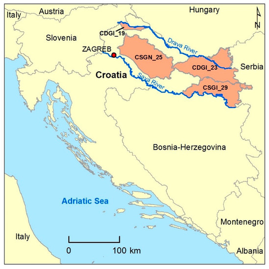 This area is characterized by vast plains of the Sava and Drava rivers, in which gravel and sand aquifers are formed at different depths. These aquifers are rich in water and represent the main water supply resource of the northern part of Croatia [26]. In the hilly area between Sava and Drava plains, small alluvial aquifers are contained in the catchment areas of large rivers tributaries, while spatially limited carbonate fissure and karst aquifers are found in the highest, mostly isolated parts of the hilly area. Table 1 lists the total thickness and average hydraulic conductivity of gravel and sand layers in each groundwater body as well as the area of four groundwater bodies analysed.