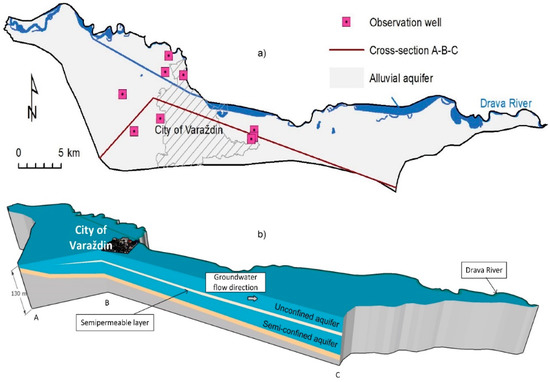 Groundwater body CDGI_19 is in the western part of the Drava River plain (Figure 1). It is filled with thick gravel and sand layers separated by silt and clay interlayers and lenses. The groundwater body comprise two alluvial aquifers. The upper unconfined aquifer is of Quaternary age and is built of coarse-grained gravel and sand. The lower semi-confined aquifer is of Neogene age and has a higher amount of finer-grained sediments [27]. They are divided by a semipermeable silty to clayey layer of average thickness of several meters (Figure 2).