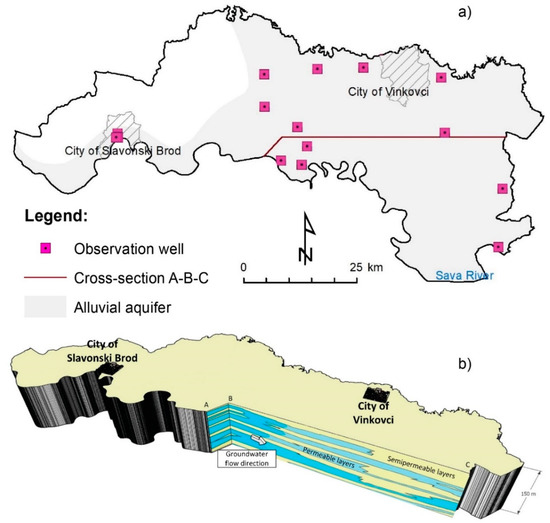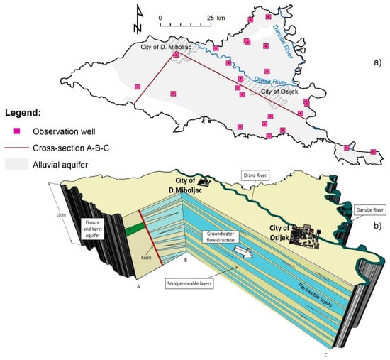 Groundwater body CDGI_23 is in the eastern part of the Drava River plain (Figure 1). Sediments in the Drava River depression mostly originate from the Alp massif and to a lesser extent from Slavonian Mountains [29]. Here, coarse and fine-grained clastic sediments alternate laterally and vertically. The aquifer system is of Quaternary age and its thickness is more than 200 m, while thicknesses of single confined and semi-confined aquifers are from five to 50 m (Figure 3). Aquifers are predominantly composed of layers of medium to fine-grained sand in the western part of the groundwater body, while the fine-grained fraction prevails in the east. Sandy layers are separated by silt and clay interlayers and lenses. In the hilly area of the groundwater body, the rocks of the Middle Triassic carbonate complex, dolomites, dolomitic breccias and dolomitic limestones, form fissure and karst aquifers.