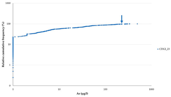 Cumulative relative frequencies of arsenic (As) for the groundwater body CDGI_23. Arrow indicates value x considered for the calculation of Mean + 2SD and Median + 2MAD ranges.