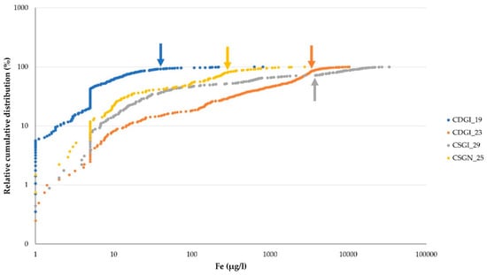 Cumulative relative frequencies of iron (Fe) for analysed groundwater bodies. Arrow indicates value x considered for the calculation of Mean + 2SD and Median + 2MAD ranges for each groundwater body.