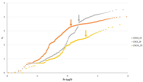 Figure 7 depicts the cumulative relative frequencies of iron. Significant visual deviation at the lower end of curve from the main body of data is identified for groundwater bodies CDGI_19 and CSGN_25. These observed deviations are related to analytical imprecision due to high percentage of <LOQ values in data set, which is particularly evident for the body CDGI_19 (27.3%). Small alterations of the slope at the upper end of data distribution can be visually identified for all plots.