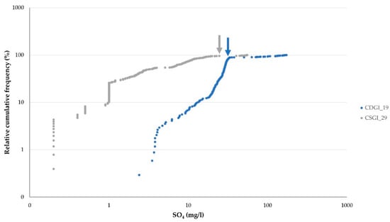 Cumulative relative frequencies of sulphate (SO4) for groundwater bodies CDGI_19 and CSGI_29. Arrow indicates value x considered for the calculation of Mean + 2SD and Median + 2MAD ranges for each groundwater body.