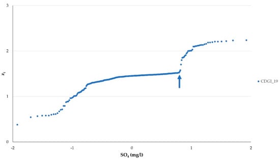 Lognormal probability plot of sulphate (SO4) for the groundwater body CDGI_19. Arrow indicates inflection point that separate ambient and non-ambient populations.
