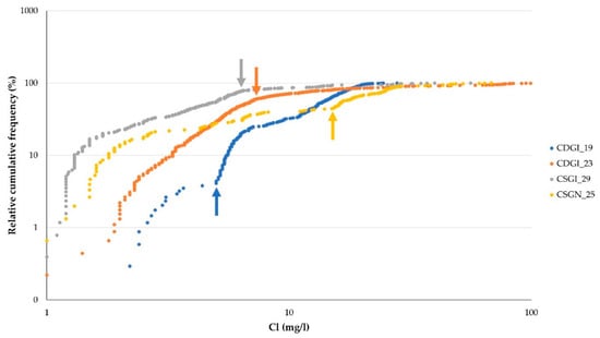 In the lognormal plot (Figure 10), multiple inflection points can be identified at the middle part and at the upper end of CDGI_19 data distribution, which denote thresholds between several natural and/or anthropogenic populations in groundwater of this shallow alluvial aquifer system.