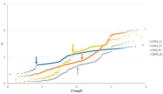 Lognormal probability plot of chloride (Cl) for analysed groundwater bodies. Arrow indicates inflection point that separates ambient and non-ambient populations for each groundwater body.