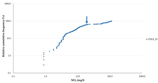 Cumulative relative frequencies of nitrate (NO3) for the groundwater body CDGI_19. Arrow indicates value x considered for the calculation of Mean + 2SD and Median + 2MAD ranges.