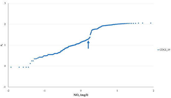 Lognormal probability plot of nitrate (NO3) for the groundwater body CDGI_19. Arrow indicates inflection point that separates ambient and non-ambient populations.