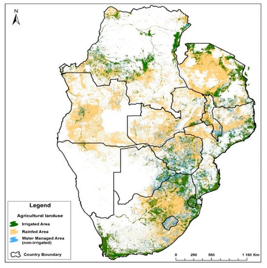 In 2015, the total irrigated area in the region stood at 9 million ha, representing only 9% of total cultivated land of 107 million ha, yet it consumes over 70% of the available freshwater resources [,]. Most of the irrigated area is concentrated in countries on the east and south, that is, South Africa, Zimbabwe, Mozambique, and Tanzania (Figure 1).