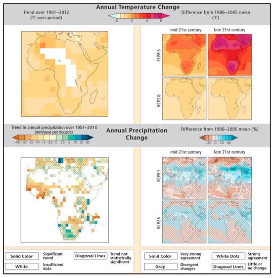 - Niang, I.; Ruppel, O.; Abdrabo, M.; Essel, A.; Lennard, C.; Padgham, J.; Urquhart, P. Africa. In Climate Change 2014: Impacts, Adaptation, and Vulnerability. Part B: Regional Aspects. Contribution of Working Group II to the Fifth Assessment Report of the Intergovernmental Panel on Climate Change; Barros, V., Field, C., Dokken, D., Mastrandrea, M., Mach, K., Bilir, T., Chatterjee, M., Ebi, K., Estrada, Y., Genova, R., et al., Eds.; Cambridge University Press: Cambridge, UK; New York, NY, USA, 2014; pp. 1199–1265. [Google Scholar]