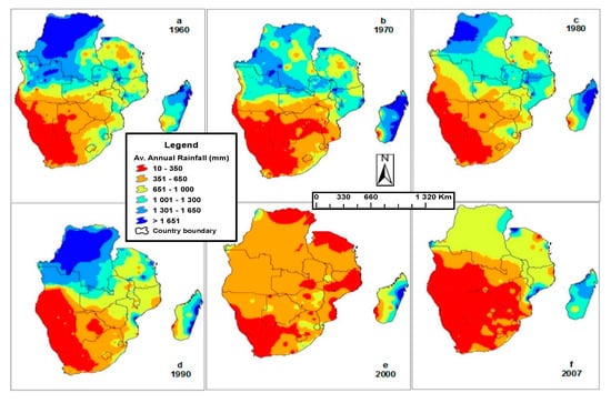 The spatial distribution of observed annual rainfall in Southern Africa is shown in Figure 3. The data are from the Food and Agricultural Organization (FAO) and are at five 10-year intervals from 1960 to 2000 and also 2007. Rainfall patterns indicate significant changes in the region during the 47 years under consideration. The results indicate significant decline in total annual rainfall in the region. Rainfall totals in the region declined by 25.6% between 1960 and 2007 []. Detailed analysis of Figure 3f (representing rainfall pattern for 2007) indicates that almost half of the region’s surface area is now arid. In addition, annual rainfall data for 2007 shows that greater parts of the region received less than 350 mm of rainfall, classifying the region into a water scarce category, and thus becoming a climate hotspot region. Reduced rainfall is exacerbating regional vulnerabilities, which already suffers water, energy, and food insecurity.