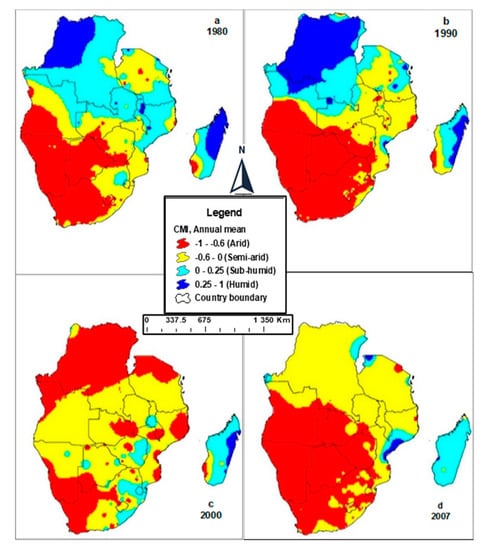 The spatio-temporal changes in aridity and water scarcity over time (1980–2007) in the region is given in Figure 4. The Climate Moisture Index (CMI) values for the region are negative or below zero, which is an indication that potential evapotranspiration (PET) is higher than precipitation []. Vörösmarty et al., [] argues that CMI values and climate situation in a given area are linked and are classified as follows: Arid (CMI less than −0.6); semi-arid (CMI between −0.6 and 0); sub-humid (CMI between 0 and 0.25) and humid (CMI above 0.25). The Southern Africa region’s estimated CMI value was −0.80 indicating that it is water scarce and arid. The observed negative changes in rainfall, water scarcity and continued aridness in Southern Africa compliments results from other studies, which also showed negative changes in rainfall and other climatic conditions in the region [,,]. Overall, aridity in the region increased by 10.8% during the period 1980–2007, exposing the worsening aridness and water scarcity in the region. Figure 4 shows that the aridness in the region has been increasing over time, a bad scenario affecting local agriculture production conditions and hence performance of the agriculture sector.