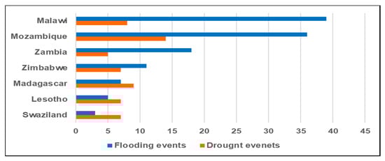 The intensity and frequency of extreme droughts and floods has increased in recent years across the region and these are expected to worsen in the future [,]. Figure 5 shows the number of drought and flooding events that occurred in selected Southern African countries between 1960 and 2018. Flooding is the most frequent of the two extreme events, occurring at an average of once in every two years, with Malawi, Mozambique, Zambia, Zimbabwe, and Madagascar being the most affected (Figure 5). The same countries are also the most affected by drought events, which are occurring at an average of once in every three years []. The frequency of droughts further confirms the drying conditions in Southern Africa. Agricultural output is affected the most by extreme events (mainly droughts and floods) and extreme variability in climatic variables resulting in both direct short-time and long-term impacts on agriculture output and overall sector performance [].