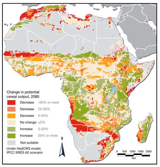 Empirical evidence indicates that agriculture food systems and communities vulnerable to extreme weather changes are expected to be more vulnerable in future climate change shocks [,,,]. Differential climate change impacts on agriculture food systems will be experienced across locations depending on the severity of warming and changes in rainfall patterns and its distribution []. Results from Lobell et al. [] found that Southern Africa is one region that would likely experience adverse impacts on multiple major crops (such as maize, wheat and sugarcane) important for food security due to increased warming and decreases in rainfall. The impacts are expected to be severe in semi-arid and arid regions such as the western parts of Southern Africa. Figure 6 and Figure 7 below demonstrates the projected climate change impacts on cereal and agriculture productivity in Africa, respectively.
