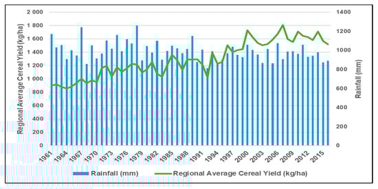 Figure 7 presents relational trends between rainfall variability and cereal production in Southern Africa based on observed data of both variables from 1961 to 2015. There is a correlation between changes in rainfall and cereal production in the region (Figure 7). Some periods of lows in rainfall coincide with lows in cereal production (Figure 7) indicating the impacts of drought on crop production in the region. Rainfall variability is, therefore, impacting on agricultural performance, although the figure does not mean causality between the two variables.