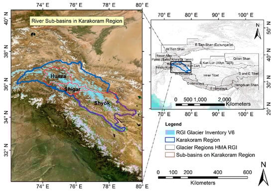 The Karakoram region extends between the longitudes 72.44° to 79.64° E and latitudes 33.14° to 37.47° N, as shown in Figure 1, with an area of 104,010 km2 (Table 1). The altitude of the region ranges from 1236 to 8611 m above sea level (m a.s.l.) with a mean altitude of 4709 m a.s.l. Westerlies are the dominant climatic system in the region. The Hunza, Shigar and Shyok are high-altitude basins of the upper Indus Basin (UIB). More than 60% of the glaciers of the Indus basin are found in the Karakoram region [27] and are mostly fed by avalanches, redistribution by wind, and seasonal snow. Approximately 22% of the Karakoram region is covered by glaciers, of which 27.8%, 24.9%, and 39.03% are found in the Hunza, Shigar and Shyok basins, respectively. The Hunza River Basin is a northern subcatchment of the UIB located in the western Karakoram region of Pakistan. The Hunza river is one of the major tributaries of the Indus River irrigation system, and it contributes approximately 12% of the upper Indus flow upstream of Tarbela Dam [7]. It has a catchment area of 13,745 km2 with an elevation range of 1450 to 7404 m a.s.l. The SCA reaches up to 80% in winter and reduces to 30% in summer [18]. The Shigar Basin is located in central Karakoram. This catchment occupies an area of 7050 km2. The total glacierized area of the catchment is 5701 km2. Some of the well-known and important glaciers in the catchment are the Biafo and Baltoro. The SCA reaches 88% in January and decreases to 10% in August [28]. The Shigar Basin receives approximately 67% of its annual precipitation in winter [29,30,31,32]. The Shyok Basin has a catchment area of 33,419 km2 and is located in the eastern Karakoram. Snow remains a dominant cryospheric component in the basin [33]. The seasonal variation in the SCA over the Shyok River Basin ranges from 27% to 59% with the maximum in February and minimum in July [24].