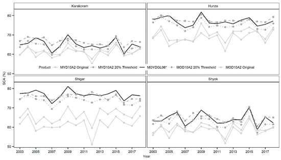 The intra-annual (mean monthly) SCA variability using the original M*D10A2, 20% cloud threshold and MOYDGL06* snow products for individual basins is shown in Figure 4. The individual basins and the entire Karakoram region show a similar pattern on a monthly scale. However, a significant difference is observed in the winter snow between the M*D10A2 and improved MOYDGL06* products (Figure 4). The original M*D10A2 products incorrectly show lower SCAs during winter. However, the improved product shows that the monthly mean SCA reaches its peak in February and is lowest in August. The <20% cloud threshold products indicate a maximum snow extent during April, which is somehow shifted from than the peak season. This may cause a dilemma in assessing the climate change impact using the product. The data-limited maximum snow shift may cause confusion between global climate change and data limitation. Thus, the original and cloud threshold M*D10A2 products are not recommended for snow climatology and hydrology. The analysis of the improved MODIS data shows a smooth increase in the SCA from September to February and a decrease from March to August. The duration from September to February is the snow accumulation period and March to August is the ablation period. For example, Figure 4 shows that 80% of the Shyok Basin was covered by snow between February and March, which reduces to <40% in August.