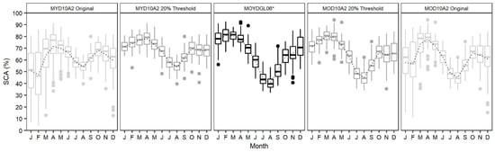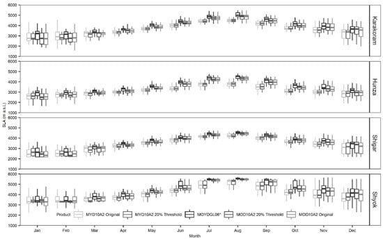 The seasonal variability in the SCA (%) derived from the original M*D10A2, <20% cloud threshold, and improved snow MOYDGL06* products in the Karakoram region is shown in Figure 3. The box and whisker plots represent quartiles of 8-day SCA variability at a monthly scale. The results indicate that the mean SCA is lowest in August in the original Terra (45%), cloud threshold Terra (44%) and improved product (41%) coverage. The lowest snow from Aqua is 48% in February, which is unexpected and attributed to persistent clouds (40%). However, this signal was not observed in the Aqua < 20% cloud threshold product. The mean SCA is the highest by 81% (median SCA = 82%) during late winter and early spring in the improved snow product. In contrast, the highest mean snow cover in the M*D10A2 products are comparatively low with 72% in Aqua and 78% in Terra during midspring. The monthly SCA variation shows conspicuous differences between different products. The maximum median snow cover extent was observed during March (81%) and April (79%) in the Terra and Aqua <20% cloud threshold products, respectively. The original MODIS product produces a bimodal distribution of intra-annual variation in the SCA, whereas the cloud threshold and improved products show a unimodal distribution. Generally, a bimodal distribution is common in the monsoon-dominated catchments and unimodal in the westerly-dominated regions [47]. However, the original product shows a bimodal distribution in the westerly-dominated Karakoram region. The bimodal pattern is attributed to the inherent uncertainty in the M*D10A2 products causing higher SCA variability. However, the cloud threshold products have a similar pattern to the improved data, with a noticeable difference during the winter months. Thus, the 8-day improved snow cover provides accurate snow cover information compared to the 8-day MODIS original and cloud threshold snow cover products.