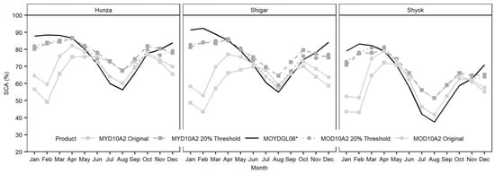 Monthly mean SCAs in the Hunza, Shigar, and Shyok basins.