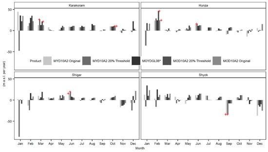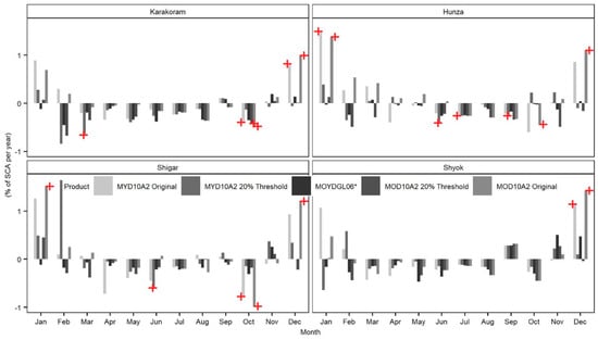 Monthly mean SCA trends in the Hunza, Shigar, Shyok, and Karakoram. Bars with plus signs represent statistically significant trends at the 90% confidence level.
