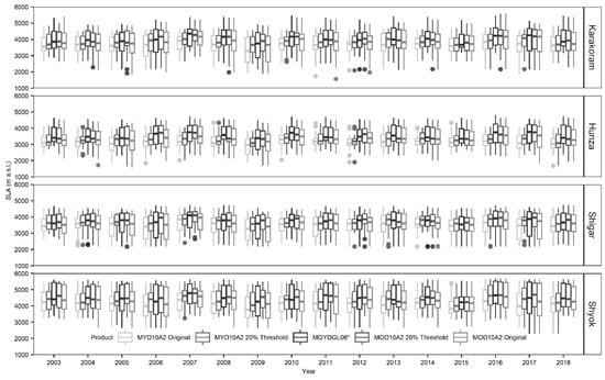The spatiotemporal variations of the SLA are assessed in the Karakoram region and its subbasins. The seasonal variability in the 8-day SLA is presented in Figure 7. The box whiskers represent quartiles of the monthly variability in the snowline estimated during 2003–2018. A clear underestimation of the SLA throughout the study period was observed by the original and the cloud threshold products across all the study sites as indicated by the thick line drawn inside each box in Figure 7. All products show a significant fluctuation in SLA during autumn and winter months. The snowlines are lowest between January and February throughout the region using all products. The lowest monthly median SLA using the improved MOYDGL06* product is 3149, 2957, 2623, and 3385 m a.s.l. in the Karakoram, Hunza, Shigar, and Shyok, respectively. The time of the minimum snowline coincides with the observed maximum SCA. In contrast, the minimum median SLA estimates in the original snow products are dissimilar to the SCA statistics. The highest monthly median SLA was observed in August using all products throughout the region. This observation indicates that the SLA estimates represent the snow dynamics better than the SCA in the original products at the seasonal scale. Original and cloud threshold products provide nearly identical monthly median values indicating the robustness of the snowline algorithm to deal with the cloudy image to some extent. However, we recommend the use of the improved product to understand snow variability more confidently. The median monthly SLA in Shyok using the improved product is the highest (5545 m a.s.l.). For the Karakoram region, the highest monthly median SLA is 4999 m a.s.l. The snowline varies significantly in autumn and winter due to snowfall and seasonal snow onset. The snowline starts to shift downward after August due to the combined effect of a lower temperature and fewer precipitation events and reaches its minimum value in January and February.