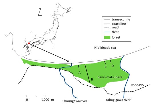 Map showing the location of Sanri-Matsubara forest, south-western Japan, and the position of survey transects (A: 300 m; B: 1040 m; C: 340 m; and D: 300 m) established in the coastal forest on the Sanri-Matsubara Forest. Survey transects were established on the coastal forest perpendicular to the coastline. Sampling points were located at 10 m intervals on the survey transects.