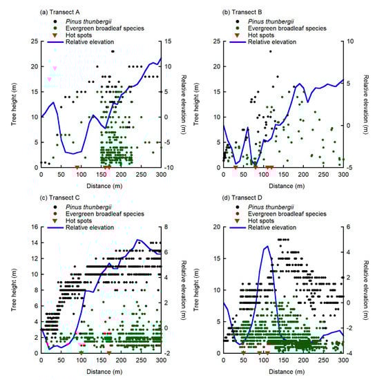 Ground surface elevation relative to the original point of each transect line, tree heights of Pinus thunbergii (black circles), and broadleaved trees (green circles) in transects A, B, C, and D (width 10 m) in the Sanri-Matsubara Forest, northern Kyushu, Japan. Whole individuals of tree height >0.5 m are shown in 150–230 m section of transect A and 0‒300 m section of transect C and D. Trees with canopy over precipitation collector (located 10 m intervals from the original point of each transect) are shown in 0‒150 and 230‒300 m section of transect A and 0‒300 m section of transect B. Hot spots of sea salt deposition (see text) are shown as red inverted triangles.