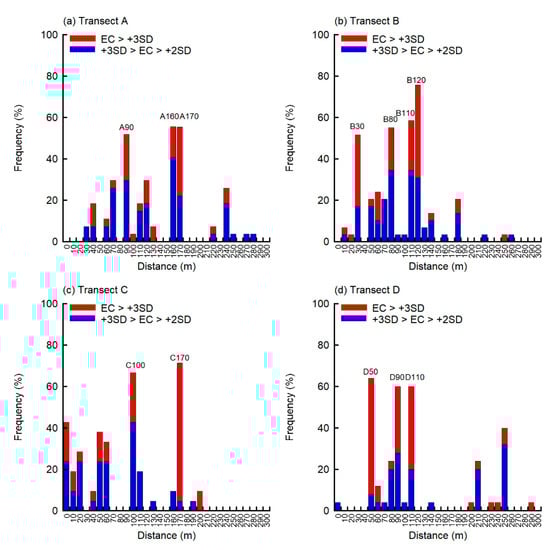 Frequency of precipitation events at every sampling point that throughfall showed extremely high value of EC (EC > +3SD; +3SD > EC > +2SD) along transects A, B, C, and D in the Sanri-Matsubara Forest, northern Kyushu, Japan. Hot spots of sea salt deposition (see text) are shown as the code of combination of transect name and distance over the bar. EC: electric conductivity; SD: standard deviation.
