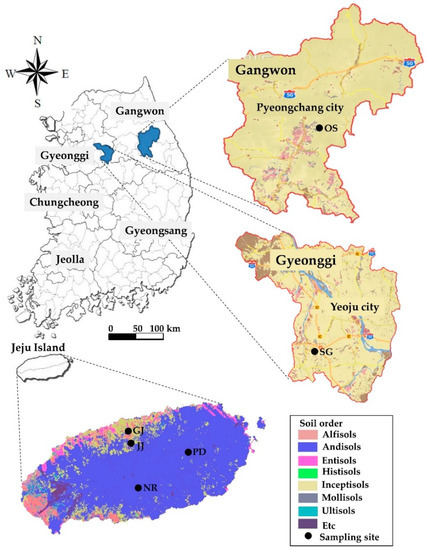 Map of the study area with soil sampling locations in Jeju Island [Andisols: Noro (NR) and Pyeongdae (PD), Ultisols: Jeju (JJ), Alfisols: Gangjeong (GJ)] and in Korean mainland forest soils [Inceptisols: Samgag (SG) and Oesan (OS)].