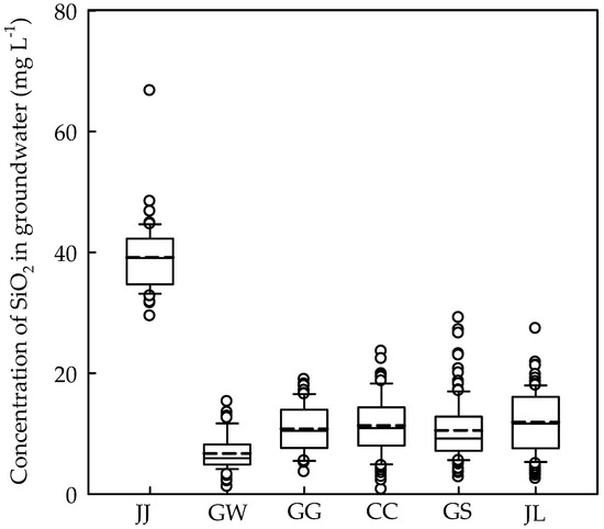 Box plots of SiO2 concentration in groundwater of South Korea. JJ: Jeju Island, GW: Gangwon province, GG: Gyeonggi province, CC: Chungcheong province, GS: Gyeongsang province, JJ: Jeolla province. Boxes represent 25th, 50th (median), and 75th percentiles, and the whiskers indicate the minimum and maximum values. Mean values (dashed line); outliers (o).