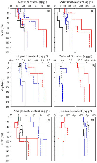 Depth fractionation of silicon in Jeju Island [Andisols; Noro (solid red), Pyeongdae (dashed red), Ultisols; Jeju (solid blue), and Alfisols; Gangjeong (dashed blue)] and Korean mainland forest soils [Inceptisols; Samgag (solid black) and Oesan (dashed black)] according to sequential extraction. (a) mobile Si, (b) adsorbed Si, (c) Si bound to soil organic matter, (d) Si occluded in pedogenic oxides and hydroxides, (e) Si in total amorphous silica, and (f) residual Si in crystalline silicates.