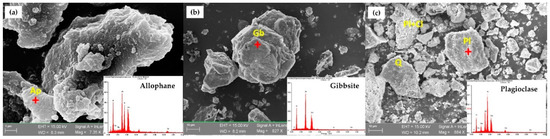 After NaOH extraction, XRD analysis for the Bw horizon from the Noro series Andisols showed that it is composed of primary minerals, such as plagioclase, orthoclase, pyroxene, olivine, amphibole, and magnetite; and secondary minerals, such as clay minerals, iron oxides, and quartz (Table 5, Figure S2). In addition, SEM/EDS analysis found that gibbsite was removed by NaOH extraction, while crystalline minerals remained (Figure 4). As with the results of Georgiadis et al. [25], 0.2M NaOH solution at 20–25 °C did not extract crystalline silicate in Andisols in this study while amorphous and poorly crystalline clay compounds seem to have been fully extracted.