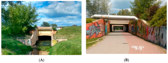 Moreover, two covered relief channels were built (Figure 5E), which, during high water events, lower the water stage in the river channel upstream of the bridge and the pond culvert by about 45 cm. Furthermore, along the Silnica river channel over long sections, aesthetic retaining walls were built to act as flood protection and are used as benches for walkers at other times (Figure 5F). These hydrotechnical investments reduce the risk of flooding in the city centre and thus provide greater security for its residents.