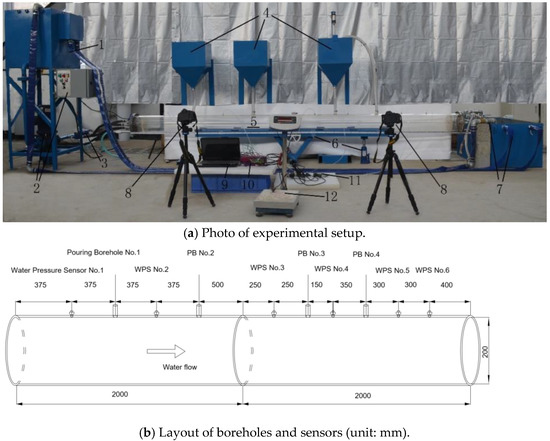 The efficiency of the plugging achieved by injecting aggregates into a submerged tunnel with flowing water is affected by many factors, including natural and engineering factors, such as the tunnel inclination, water flow rate, distance between the boreholes, aggregate particle size, water–solid mass ratio and injection speed. An experimental setup that could provide a constant water head, and adjustable and recyclable water flow at different flow rates was developed. Figure 1 shows a schematic and photo of the setup. It could control the water–solid mass ratio and pouring speed, as well as collect the data of the flow rate and water pressure in real time. The aggregate accumulation and migration images in the pipeline were captured for process analysis.