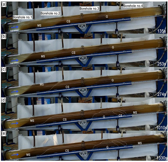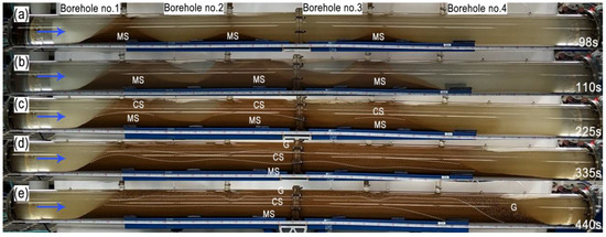 Figure 2. Aggregate deposits in Trial No. 1, with the order of pouring fine particles first and coarse particles later. MS—medium sand; CS—coarse; G—gravel. (a) at 98 s, (b) at 110 s,(c) at 225 s, (d) at 335 s, (e) at 440 s.