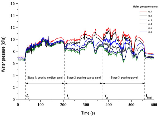 Figure 4 shows the changes in fluid pressure in the tunnel during pouring. The effects of the build-up of the aggregate mass on the water flow can be reflected by the changes in water pressures. The curve in the figure can be divided into three stages: pouring medium sand, coarse sand and gravel. In the figure, t0 is the moment of starting the pouring of medium sand, t1 is the time for which the coarse sand is poured, t2 is the time for which the gravel is poured, and tfinal is the moment at which the build-up of accumulated mass is stabilized. With the injection of aggregates with different particle sizes, the water pressure in the tunnel showed an increasing trend overall. At t0, as the sand was poured in, the aggregates accumulated under the action of gravity, and the overall water pressures rose. At the t1 moment, the pouring of coarse sand connected the accumulated sand masses until the height of the mass was no longer increased. The water pressures at Water Pressure Sensors No. 1 and 2 increased and began to exceed those at Water Pressure Sensors 3, 4, 5 and 6, while the pressure fluctuations were obvious. At the t2 moment, the tunnel was filled with gravel for capping. Although the efficiency of water plugging was unsatisfactory, the pressure at Water Pressure Sensors No. 1 and 2 began to rise and maintain large fluctuations, while the pressure at Water Pressure Sensors 3, 4, 5 and 6 exhibited a downward trend with large fluctuation. This clearly indicates the obstructing effect of the accumulated aggregate mass on water flow. In order to achieve more efficient plugging, pouring aggregates with larger particle sizes or pouring faster is required at this point. At the tfinal moment, the build-up of accumulated aggregate mass in the tunnel is stable when the water channel does not change again.
