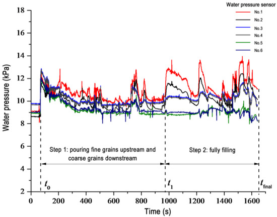 Figure 4. The water pressure in the tunnel with the order of pouring fine particles first and coarse particles later.