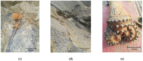 Aggregates of various particle sizes should be prepared in advance because the pouring of aggregate must be continuous, and the amount of aggregate required is relatively large. The aggregate enters the jet through the funnel and fills the tunnel through the borehole, which often becomes blocked during pouring. Figure 7d shows the flow of water out of the borehole due to blockage. If the ground aggregate-injection pipe is blocked, the pipe can be removed to poke it out; if the borehole is blocked, it can only be unblocked by drilling and sweeping it. Figure 7e is a roller drill that is needed to dislodge the large gravel, and at the same time, a larger concentration of drilling fluid is required. It is necessary to set up a vent borehole during the pouring process. Because of the continuous pouring of aggregate, the air pressure in the tunnel and the borehole is increased by the injection. The air is exhausted through the injection port; a small fountain sometimes occurs.