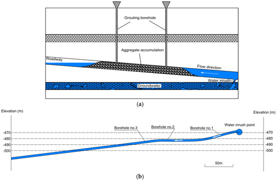 A grouting and sealing project in an inundated mine tunnel is usually implemented in two stages: pouring aggregate and grouting reinforcement. The purpose of pouring aggregate is to form a water-blocking section in the tunnel through the accumulation of aggregates and to change the pipeline flow to a permeate flow. The purpose of the grouting reinforcement is to block the voids in the accumulating mass to seal off the water, with cement slurry. Therefore, aggregate pouring is a necessary prerequisite for effective grouting, while effective grouting plays a key role in successful water blocking. Moreover, the selection of aggregate is a key issue in grouting-shutoff engineering. In a pouring project, both fine aggregates, such as fly ash and sand, and coarse aggregates, such as gravel and pebbles of various particle sizes, are generally used. In practice, the maximum particle size of the aggregate should generally not exceed 1/3 to 1/4 of the borehole’s inner diameter [1,2]. The aggregate is usually inserted with a special orifice injection device and then carried by a moderate and stable water flow through the borehole. A water–solid mass ratio between 5:1 and 15:1 is often selected [1,2]. According to the groundwater-inrush flow rate and the roadway environment, different pouring sequences are often adopted, such as pouring coarse particles first and then pouring fine ones or vice versa, and pouring coarse particles upstream and fine particles downstream or vice versa. The ultimate aim is to achieve the best efficiency of plugging.