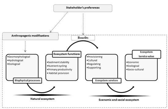 The capacity of ecosystem functions to provide ecosystem services is thus a result of interactions between various geomorphological, hydrological, and ecological processes over multiple spatial and temporal scales []. It may be physical (e.g., bioremediation), chemical (e.g., mineralization, calcification), or biological (e.g., photosynthesis, larval dispersal). For example, the ecosystem functions of primary productivity help in maintaining species diversity, which in turn provides provisioning services of food and raw materials. Similarly, the sediment stability functions of ecosystems support sediment transfers in river channels from upstream to downstream. This sustains soil productivity and food productivity for human beings.