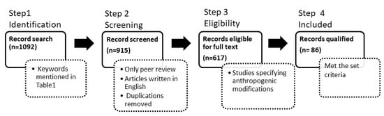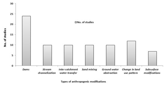 A total of 86 references were selected to map the evidence of the impact of anthropogenic modifications on river ecosystem services Figure 2. An overview of the number of papers under each type of modification is given in Figure 3. Subsequently, we cataloged and classified papers indicating the ecohydrological or geomorphological changes in river ecosystems in connection with ecosystem responses. Not all studies explicitly referred to the classification of ESs. For example, exotic species are an indicator of species diversity, contributing to supporting services. Therefore, we used ESs classified by [], and the Common International Classification of Ecosystem Services (CICES) by [] to establish connections between ecosystem responses and ESs (Table 2).