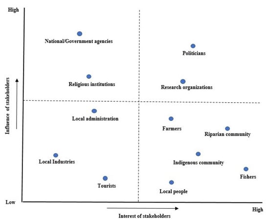 The power matrix of the stakeholders plays an important role in utilization of ecosystem services. Grimble and Wellard [] define stakeholders as all those who affect or are affected by the policies, decisions, and actions of the system. They can be individual, communities, social groups, or institutions of any size, aggregation, or level in a society (Figure 4). Some stakeholders, which include institutions, government agencies, and policy makers, have more power to carry out modifications on river landscape compared to stakeholders having low power in the matrix (e.g., fishers, indigenous people, local people). River water diverted by influential stakeholders may obstruct the freely accessible benefits (e.g., livelihood, tradition, and aesthetics) of less powerful people []. Power asymmetries among stakeholders create social conflict and can affect stakeholders’ well being. For example, the construction of dams for harvesting water for irrigation and hydro-power has resulted in the displacement of many people, especially marginal farmers, forest dwellers, riparian, and indigenous communities [,]. The livelihood support gradually declines due to displacement by dams resulting in shifting of the occupation and migration of the community []. Similarly, stream channelization and water diversion create conflicts between different upstream and downstream users []. Therefore, ecosystem service research should be informed with detailed understanding of linkages of ecosystem services with landscape signatures including socio-ecological interaction between them.